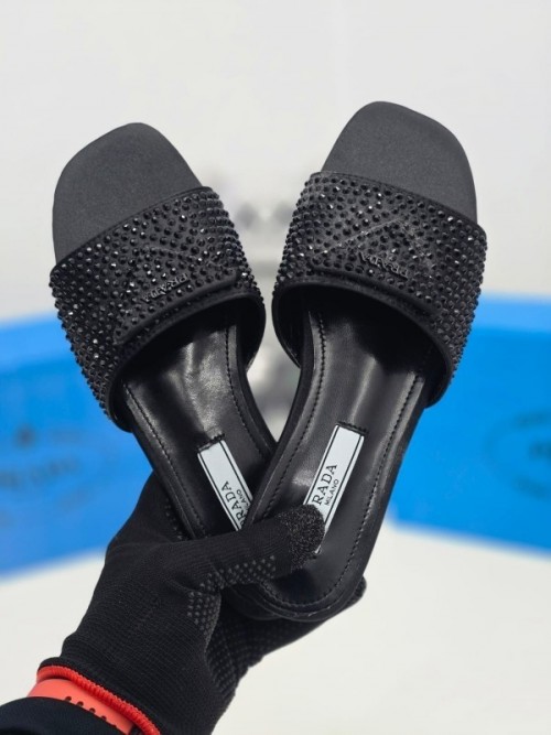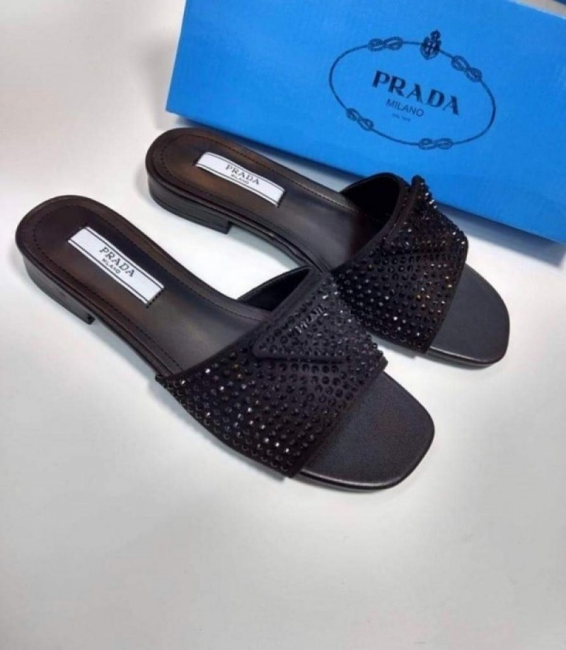 Prada Crystal Diamond Rhinestone Slides With OG Box Dust Bag All Black 901
